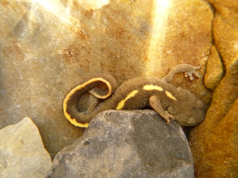 In the past 2 weeks we’ve found this shy creature in the Anisclo Canyon and in the Gargantas de Escuain. The Pyrenean newt also known as the Brook Pyrenean salamander (Calotriton Asper) is endemic to the Pyrenees. Found at altitudes between 700m and 2,500m in shallow slow moving waters favoring water temperatures of about 15 degrees celsius. They are very sensitive creatures and therefore if found are a good indicator of clean water.