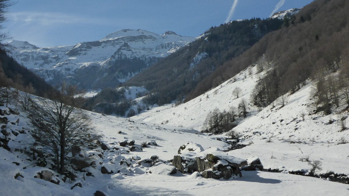But the winter has not brought much snow so far, so it is still not so easy to enjoy wintertime landscapes and adventures. So David and I decided to pass to the other side of the Pyrenees, in France, in the Aspe Valley where winter is always more wintery than on the Spanish side of the cordillera. There we went to explore a quiet remote place of the valley, a small hanging valley below the peak of Arlet. As we thought they would be little snow, we did not carry snowshoes, but actually they could have been useful as we had to walk on a snow layer that reached up to 30 cm in places.